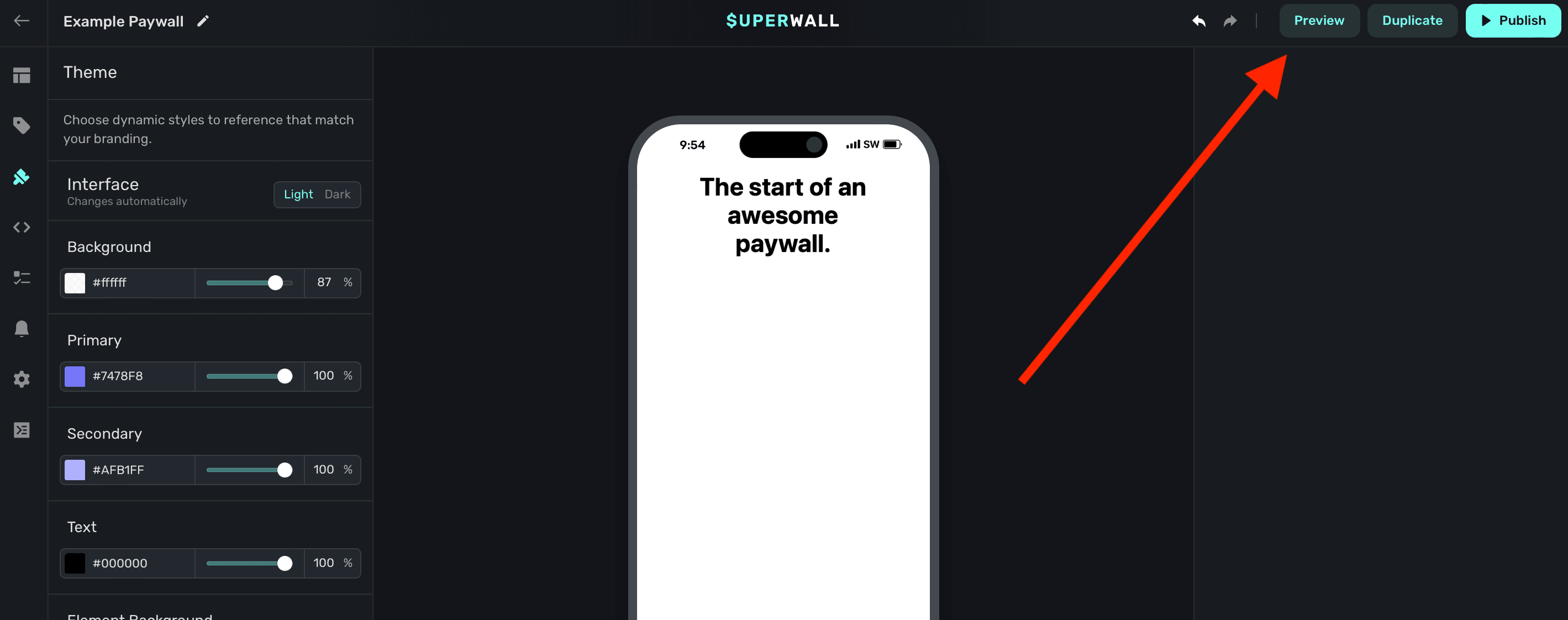 To preview a paywall on device, click Preview in the top-right side of the editor: