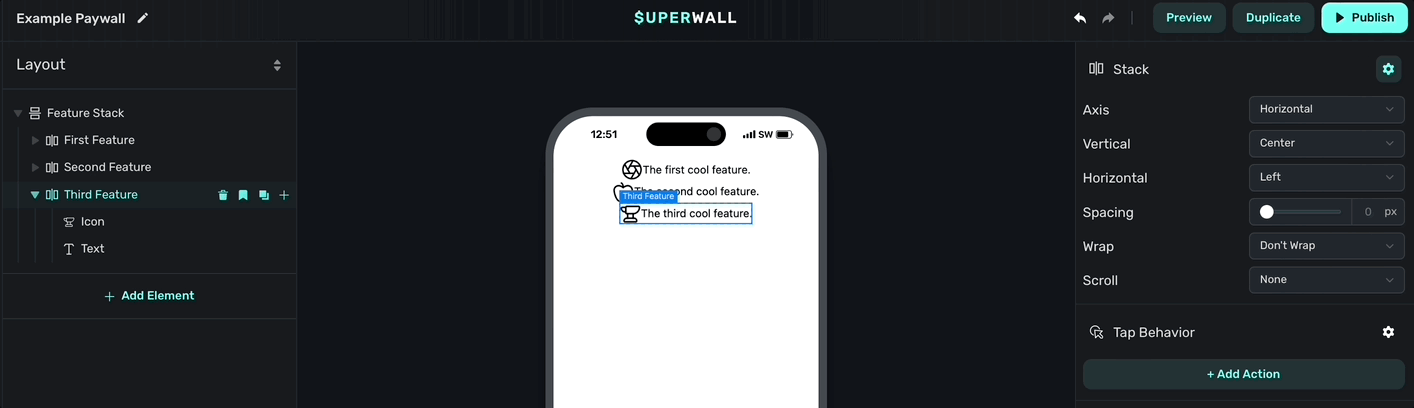 - Custom Action: Performs a custom action that you specify. Using custom actions, you can tie application logic to anything tapped or clicked on your paywall. Check out the docs here.