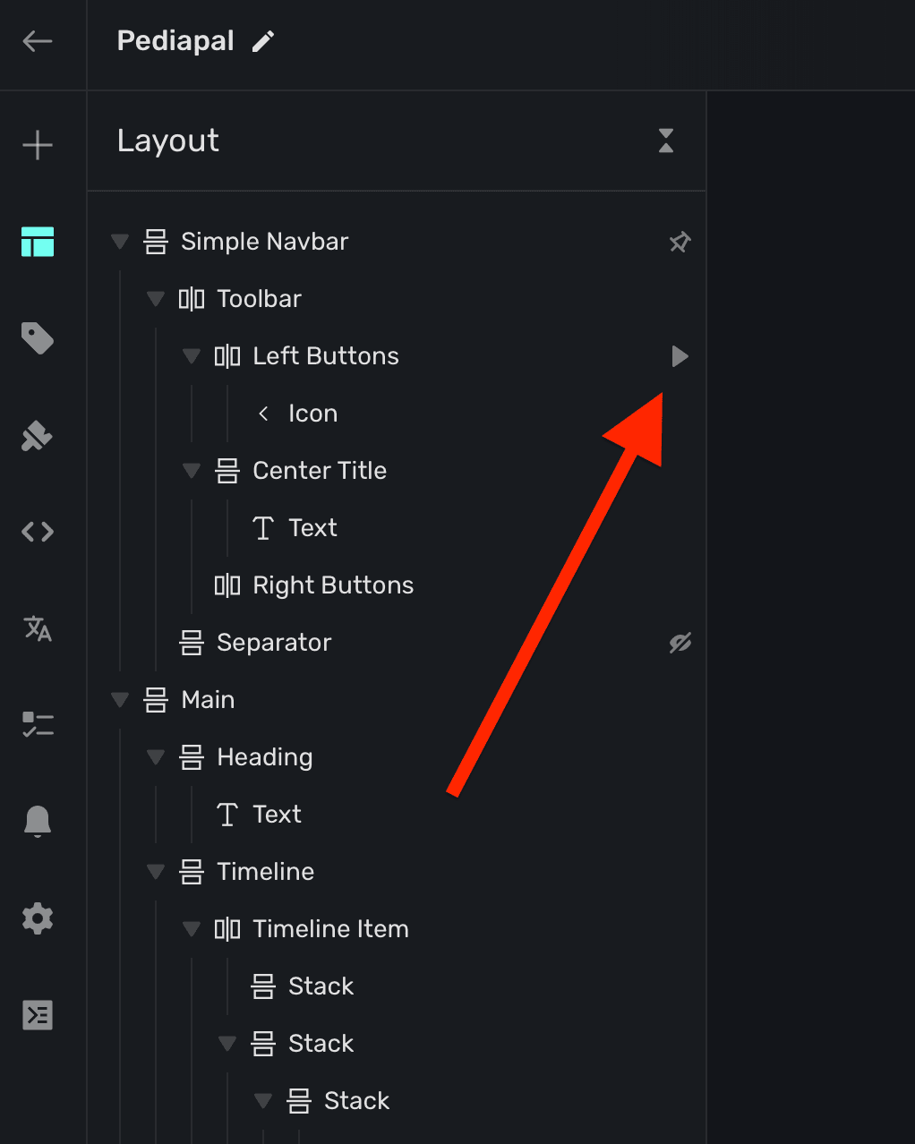 If a component has a tap action associated to it, you'll also see a triangle icon next to it within the sidebar: