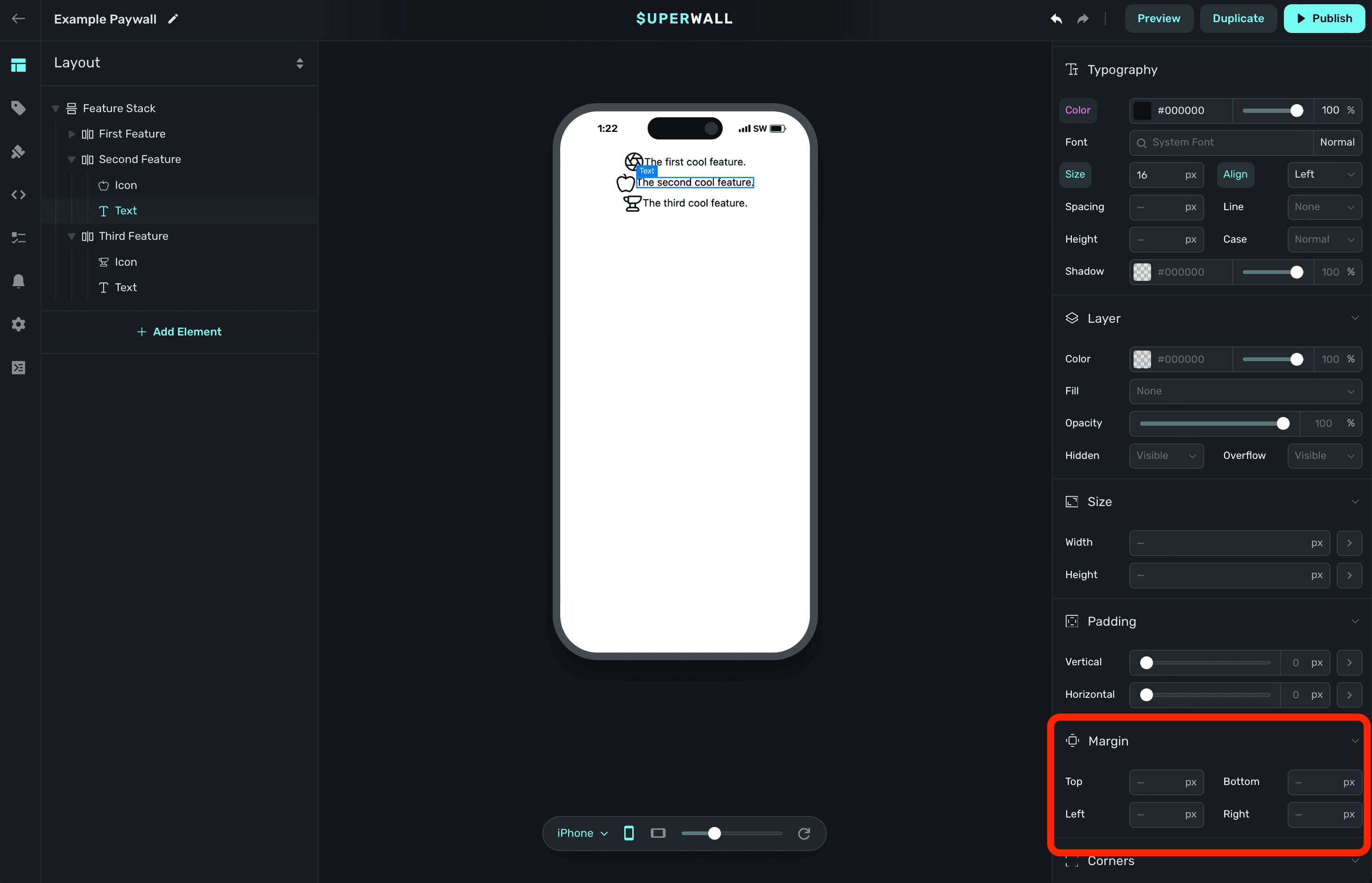 The properties below are editable regardless of which kind of component you are editing. The most important thing to keep in mind is that all of the properties below will work the same as they would on a web page. When you change these properties, behind the scenes — Superwall is applying the corresponding CSS code to the paywall.