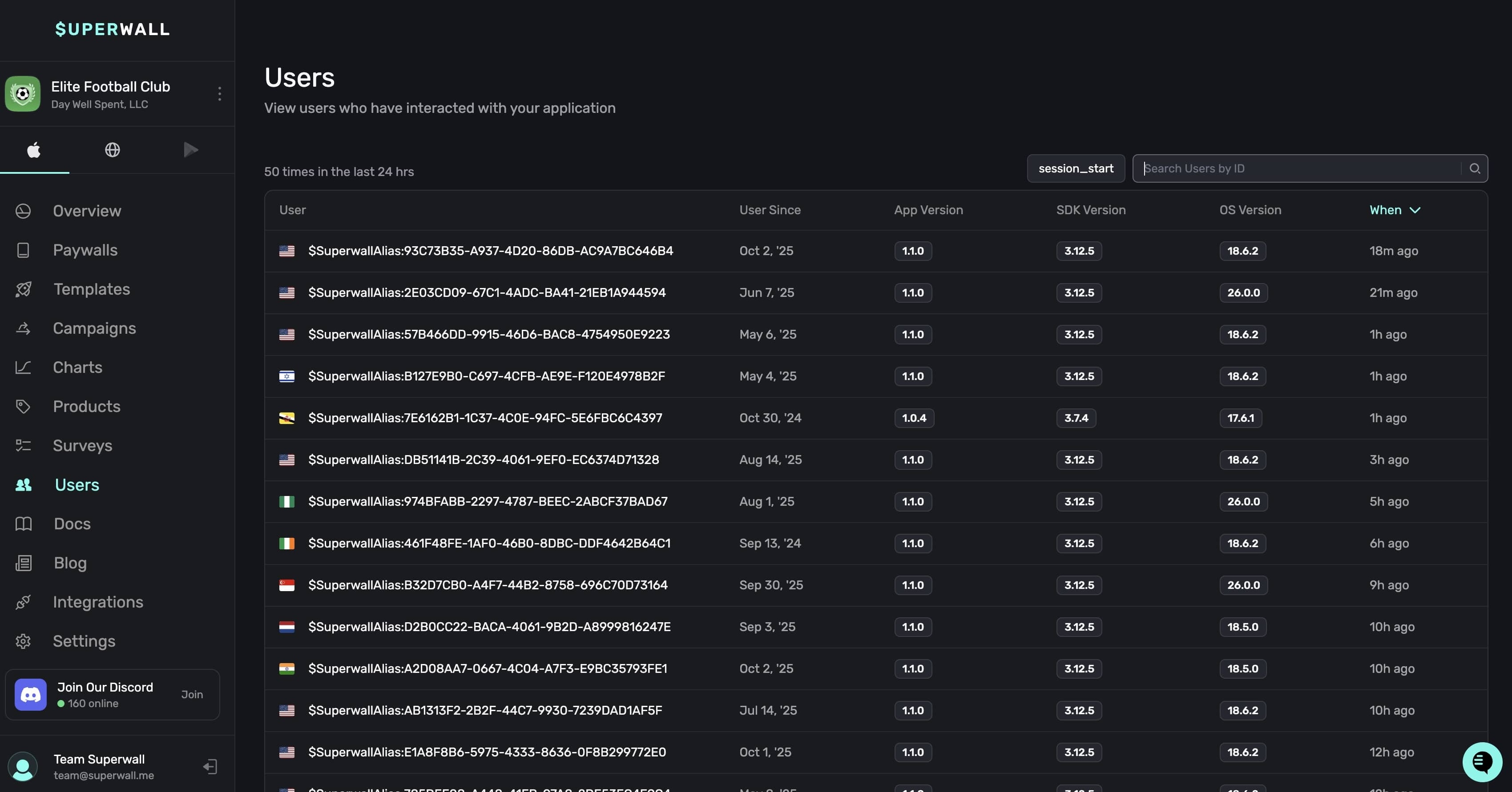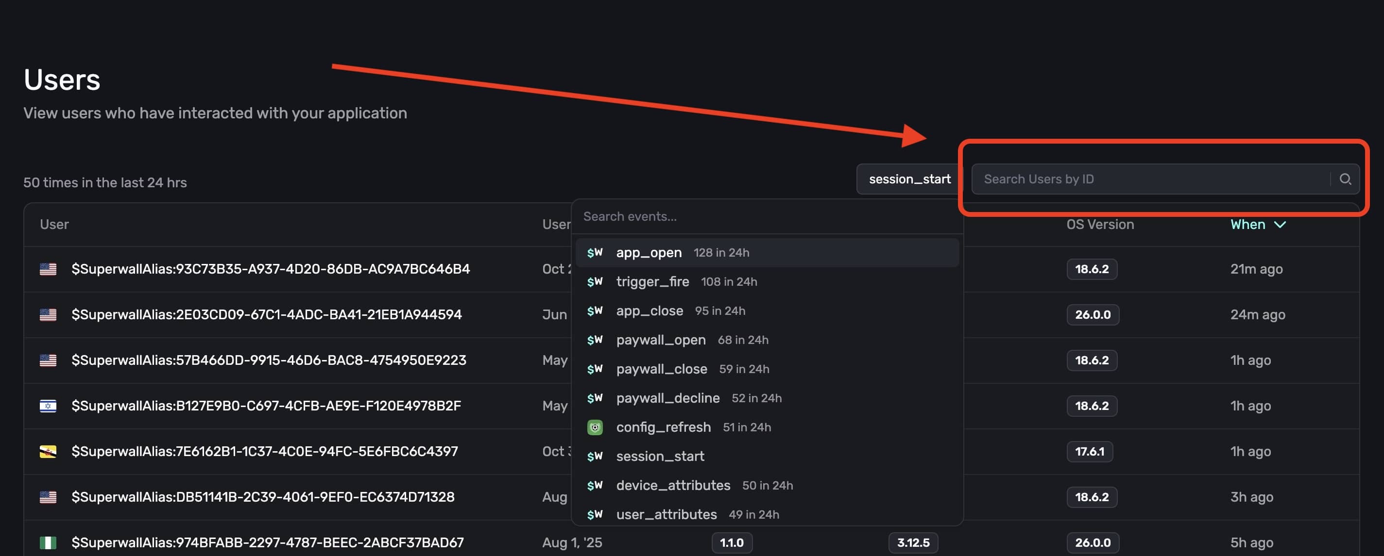 Below, Superwall displays all of the users who have opened a paywall the last 24 hours: