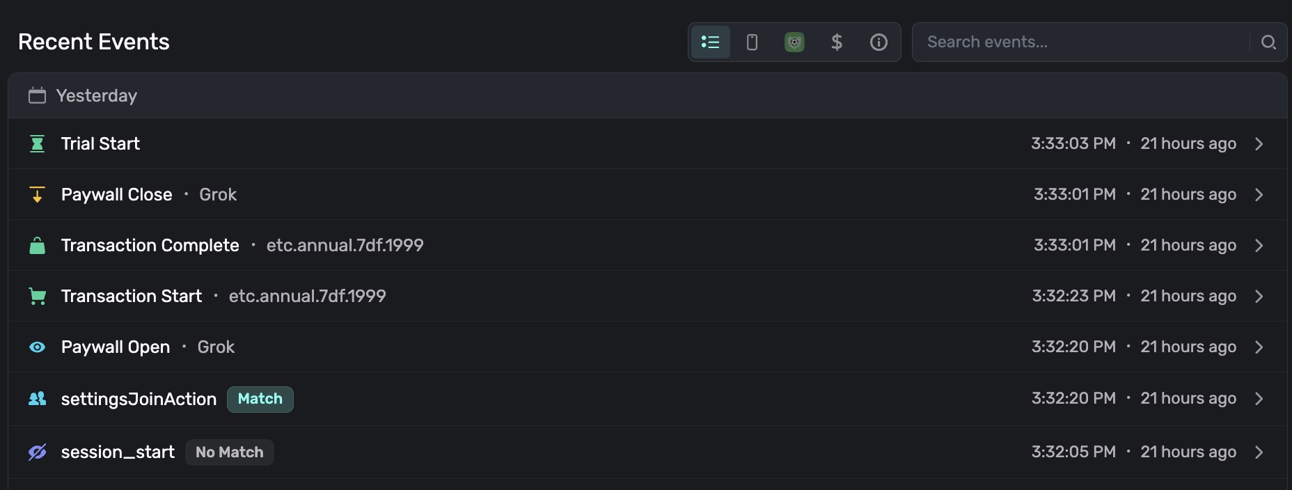 2. Recent Events: View revenue events and conversions, SDK events, and see the overall breadcrumb of actions the user has taken. You can filter or search by certain events as well.