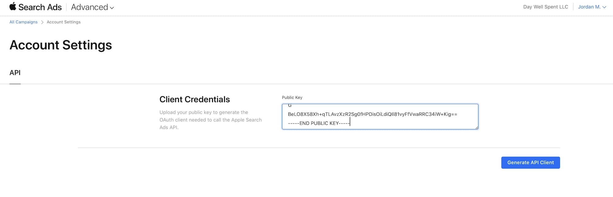 - Back in Apple Search Ads, paste the public key under Public Key and click Generate API Client: