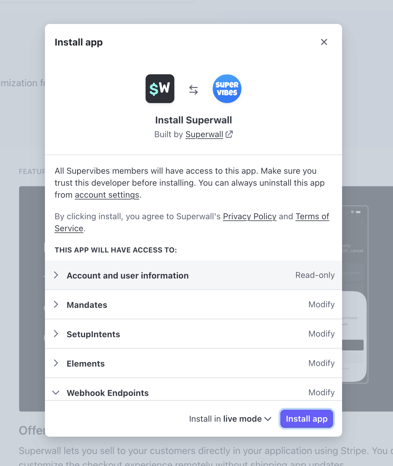 Navigate to the Superwall app in your Stripe dashboard. If already installed, find it under Apps: