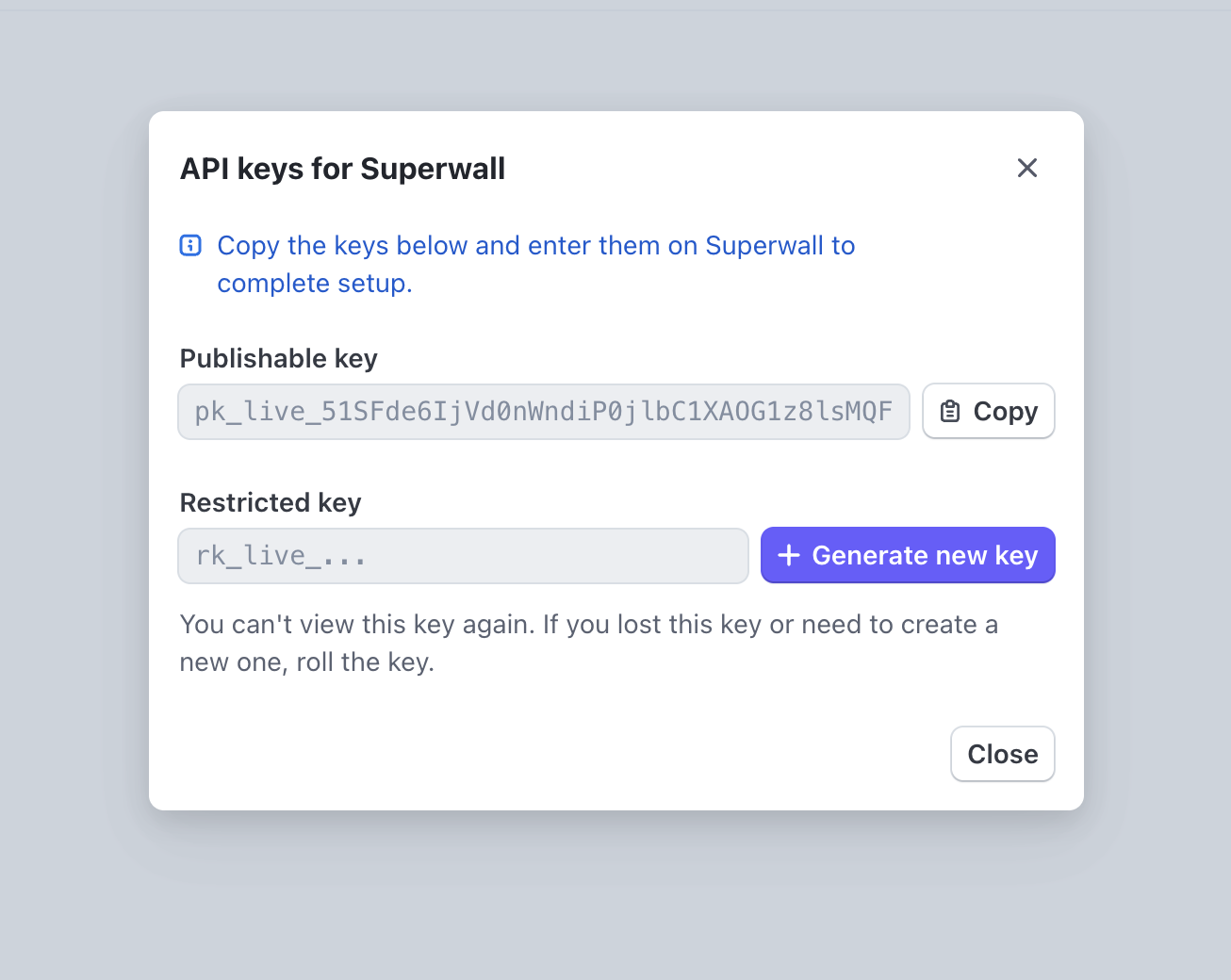 After installation, you'll receive a Publishable Key and a Restricted Secret Key with the proper permissions already configured. Copy both keys: